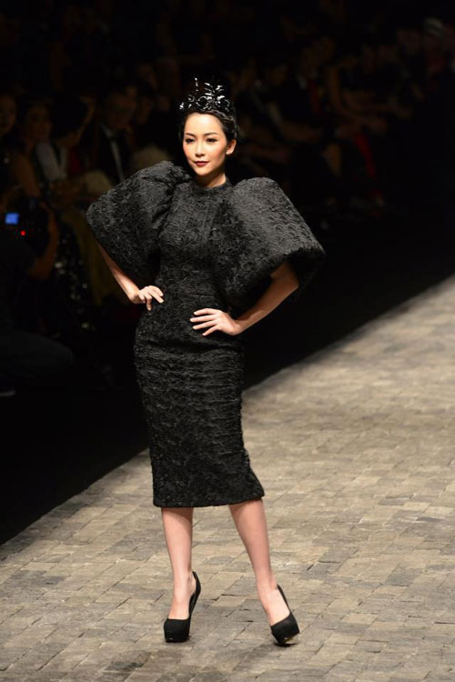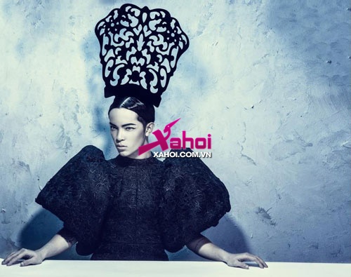 Trong vai trò người mẫu cho nhà thiết kế Đỗ Mạnh Cường, mẫu nam điển trai này gây sốc khi diện lại bộ váy tay phồng mà diễn viên múa Linh Nga đã mặc sải bước trên sàn catwalk The Muse hồi tháng 12. Trên đầu Kelbin Lei là chiếc mũ miện nặng trịch màu đen càng làm tăng vẻ nữ tính và lạnh lùng cho người mẫu.