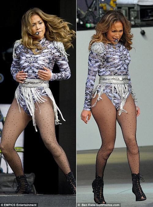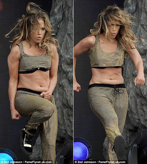 Hôm 14/7 vừa qua, Jennifer Lopez đã có những màn trình diễn đốt cháy sân khấu Barclaycard British Summertime ở London (Anh). Trong trang phục kiểu bikini, Jennifer Lopez "khoe" được đường cong nóng bỏng nhưng cũng phô luôn những điểm xấu trên cơ thể mình. Điển hình là cặp đùi quá to trong khi chân quá ngắn khiến người thân hình J-Lo bị mất cân đối. Trước đó, trên sàn tập, người đẹp 44 tuổi còn để lộ bụng chảy xệ gây choáng.